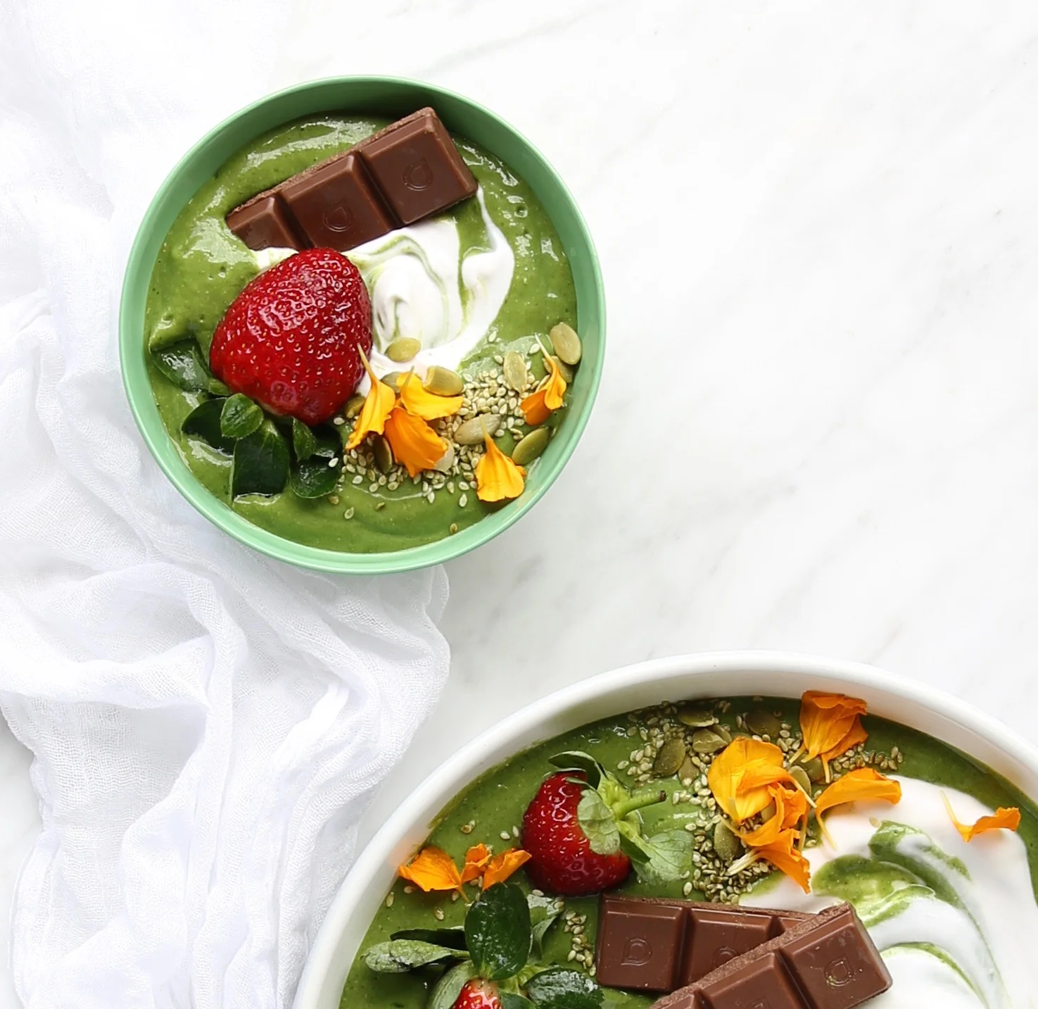 To make the smoothie place all the ingredients into a high-speed blender. Blend until smooth and creamy. Pour into two bowls and serve with your favourite toppings. Enjoy!
