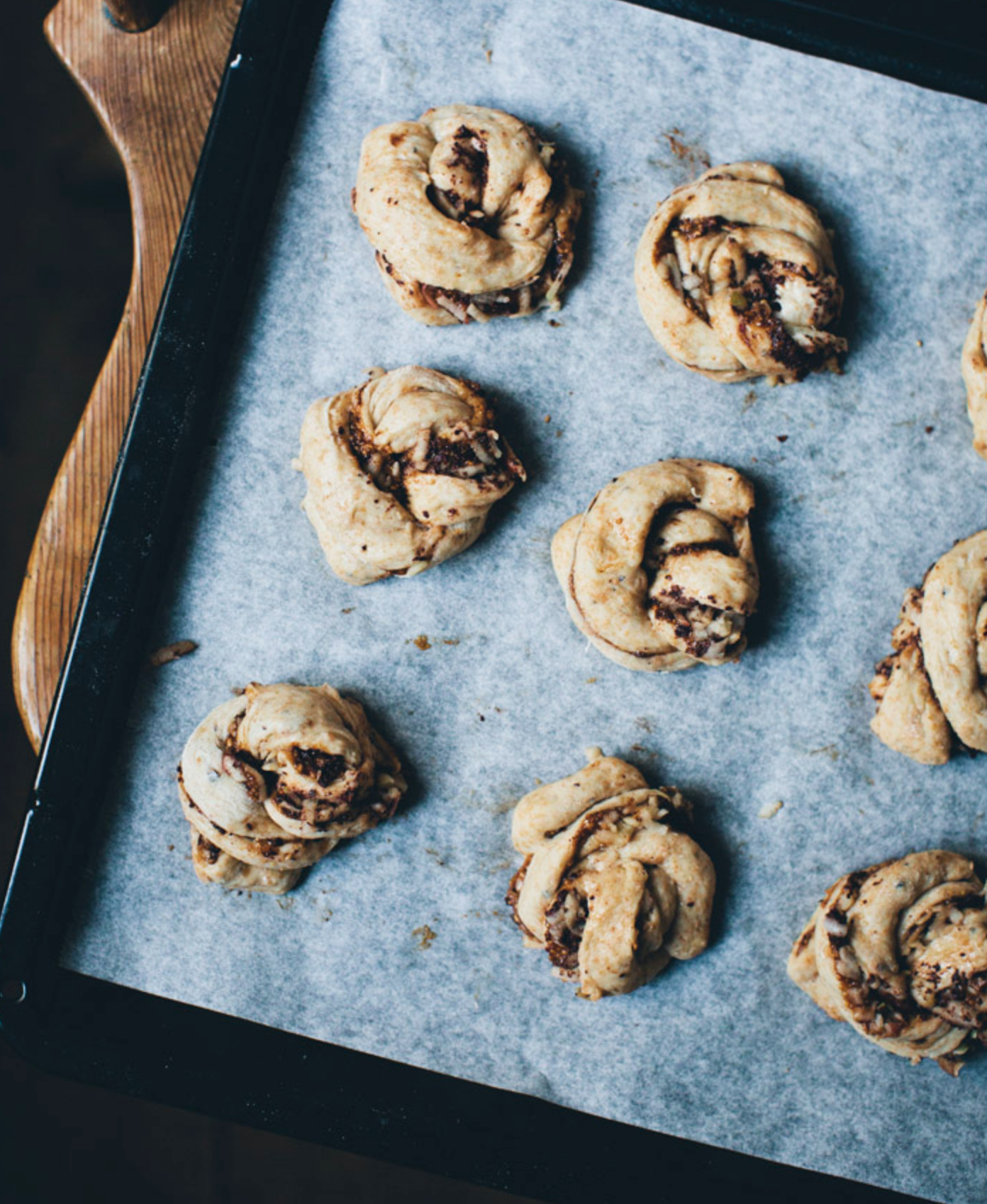 Divide the dough into two equal portions (unless you have a huge worktop, in which case you can roll the whole dough at once.). On a floured surface, roll and stretch the first dough to a rectangle, about 50 x 40 cm (20 x 16 in) wide and about 5 mm (1⁄4 in) thick. Spread half of the hazelnut butter evenly across the dough and sprinkle half of the apple shreds, half of the cardamom and the chocolate. Carefully lift one third of the dough (closest to you) and fold it two-thirds of the way up, then fold down the top third. Now you should have a rectangle that is roughly 50 x 13 cm (20 x 5 in). Use a sharp knife to cut the dough into roughly 3 cm (11⁄4 in) wide strips.