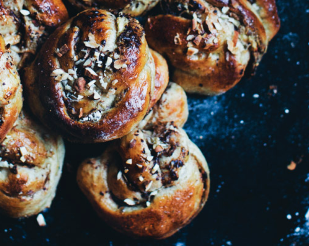 Sift the flours together and add about two-thirds of it to the yeast and milk mixture. Mix to a dough. Gradually knead in enough of the remaining flour just until soft and no longer sticky. Cover and leave to rise in a warm place for about an hour, or until double in bulk. While the dough is rising, mix together hazelnut butter and maple syrup for the filling.