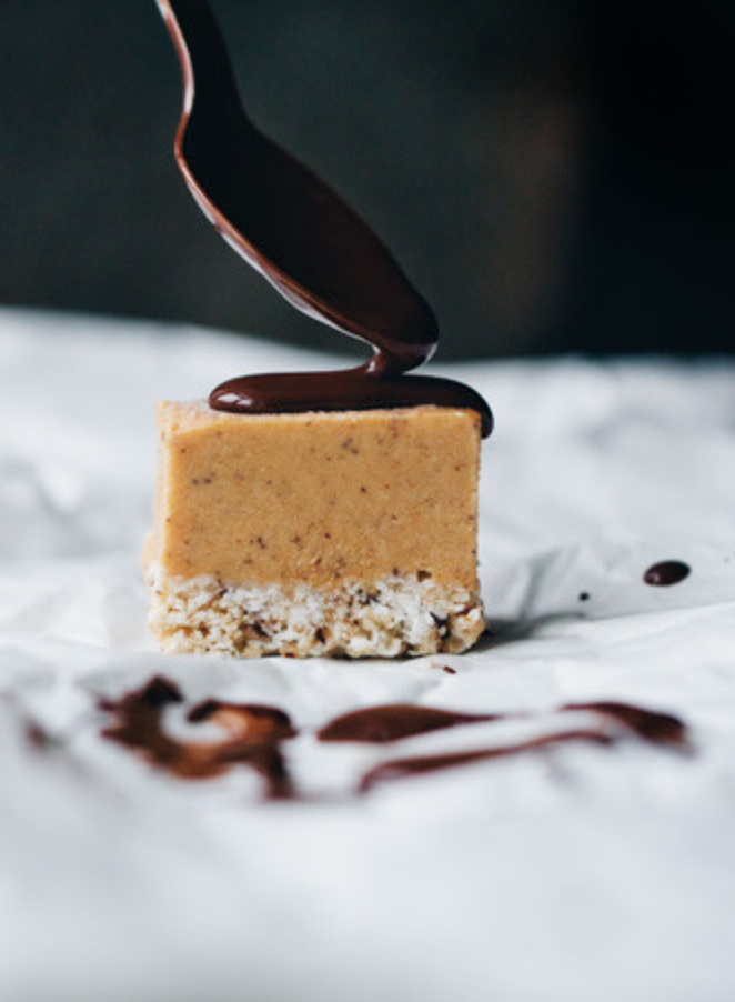 Add all the pumpkin caramel ingredients to a blender or food processor and mix on high speed until smooth. Start with 4 tbsp water and then add a splash more if the mixture is too thick to blend. When completely smooth, taste and add more salt or dates if needed. Take out the tin from the freezer and scoop the pumpkin caramel on top of the coconut base. Use a spatula to smooth out the surface or knock the tin against the table a few times to get it even. Place back into the freezer for at least three hours or until completely firm.