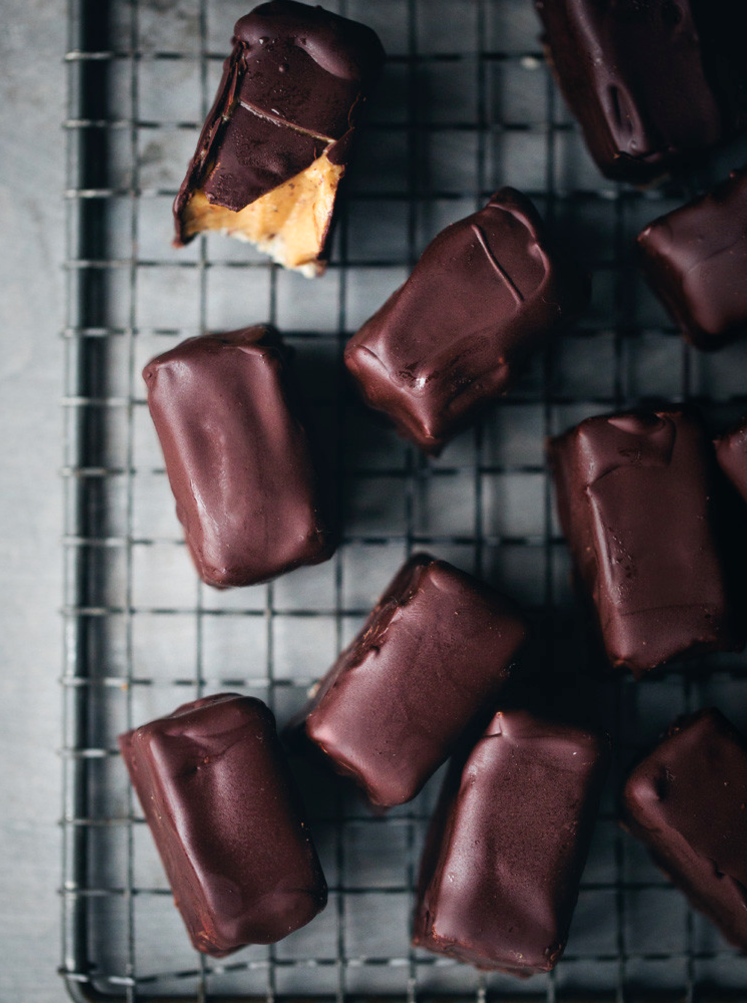 Use a knife to carefully flip the frozen mixture out of the tin. Trim the sides for more even looking bars then use a sharp knife to cut 20 bite-sized pieces, about 1 x 2 inches / 2,5 x 5 cm, that you spread out on a parchment paper (or place back into the freezer while melting the chocolate).